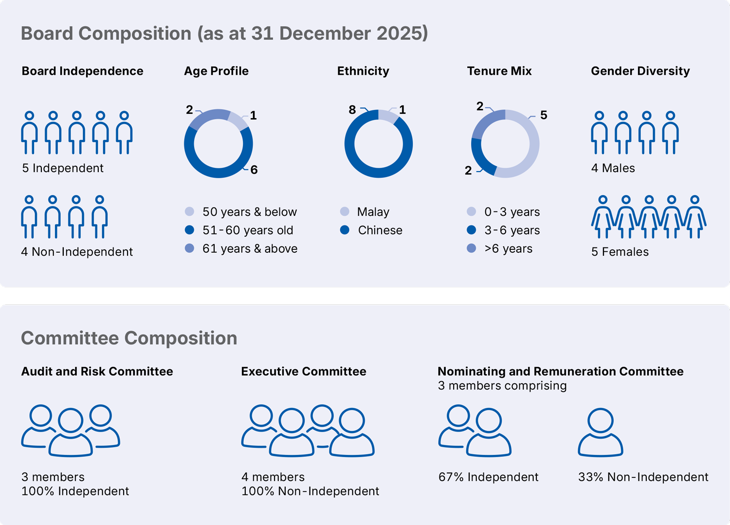 With respect to female representation, the Board's Nominating and Remuneration Committee (NRC) notes the Malaysian Code on Corporate Governance (MCCG) 2021 target of women making up 30% of the boards and Bursa Malaysia's requirement for all public listed companies to appoint at least one women director. In its annual review of the Board's composition, the NRC expressly considers and includes a commentary to the Board about diversity in the composition of the Board. As at 31 December 2024, women representation on the Board of CMRM stood at 37%, exceeding the MCCG 2021 target, and this progress underscored the Board's commitment to fostering gender diversity.