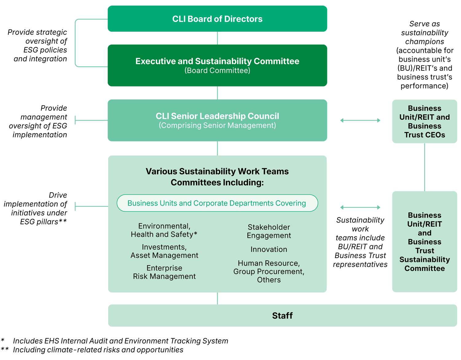 These updates are in relation to sustainability risks, and relevant performance metrics, which include carbon emissions performance, progress on achieving the reduction targets, green certification, human capital development, as well as stakeholders' expectations on climate change and/ or other social matters. The Sustainability Department works closely with key members from various departments including finance, investment and portfolio management, as well as operations department and technical teams of CLI in carrying out strategies and relevant activities, abiding by CLI's sustainability framework and policies. The Property Managers have an EHS Committee and an Engineering, Systems and Sustainability team whose role includes integrating sustainability into operations.