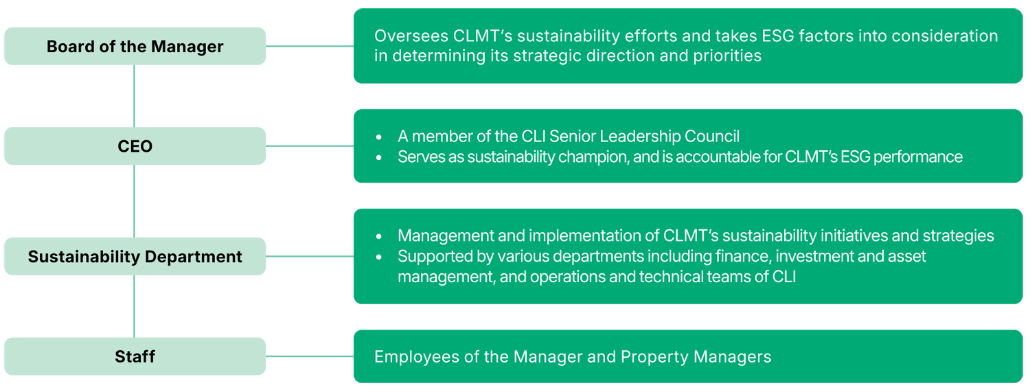A Sustainability department led by the CEO of the Manager oversees sustainability objectives and strategies directly to ensure greater focus on sustainability and climaterelated matters for CLMT. The Sustainability Department is responsible for providing timely and regular updates on CLMT's sustainability matters and progress report on 2030 SMP to the Board of the Manager.
