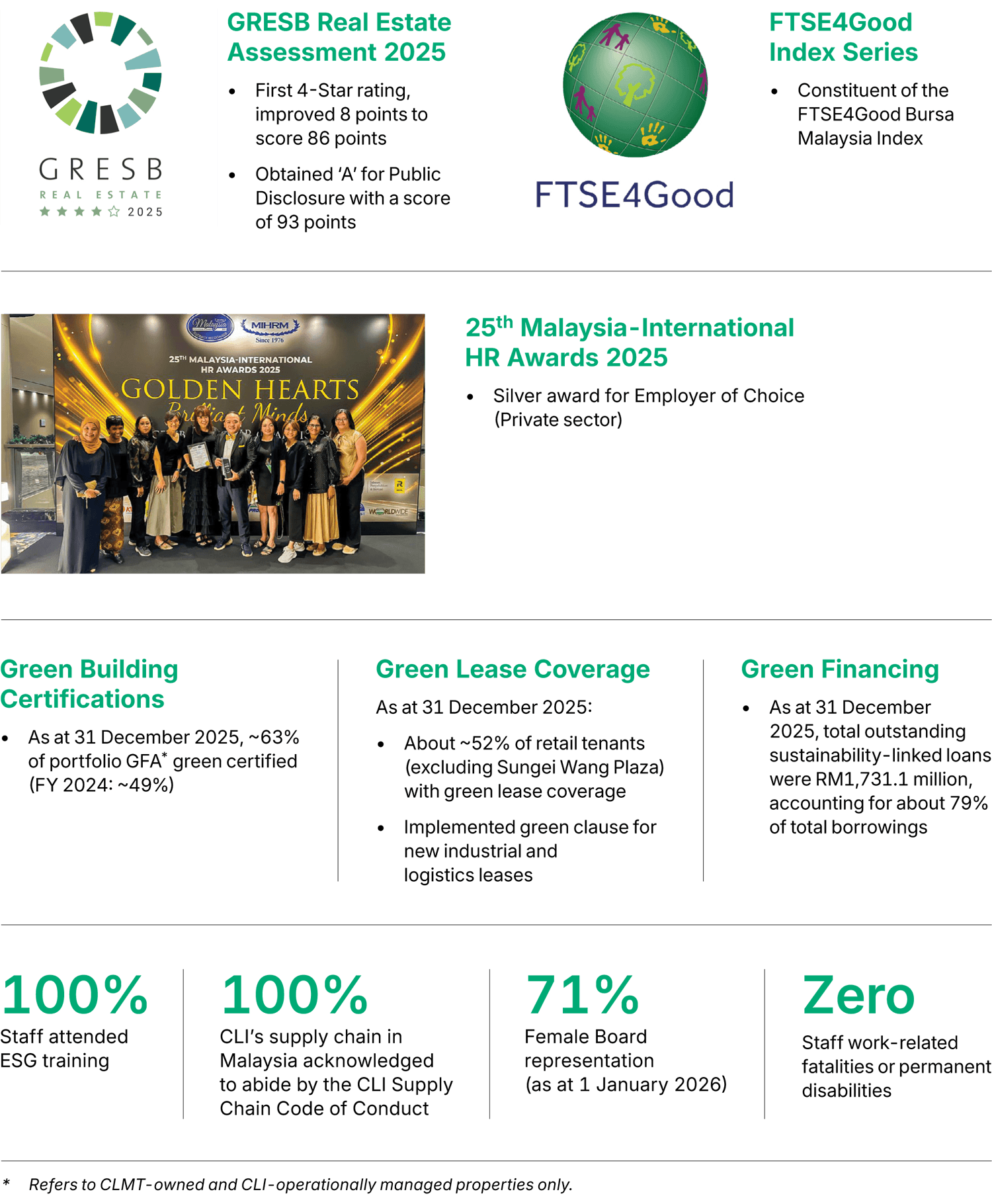 CLMT's sustainability performance has been globally recognised by leading sustainability benchmarks such as GRESB. CLMT will continue to identify and adopt meaningful ESG practices and enhance sustainability in the real estate sector.